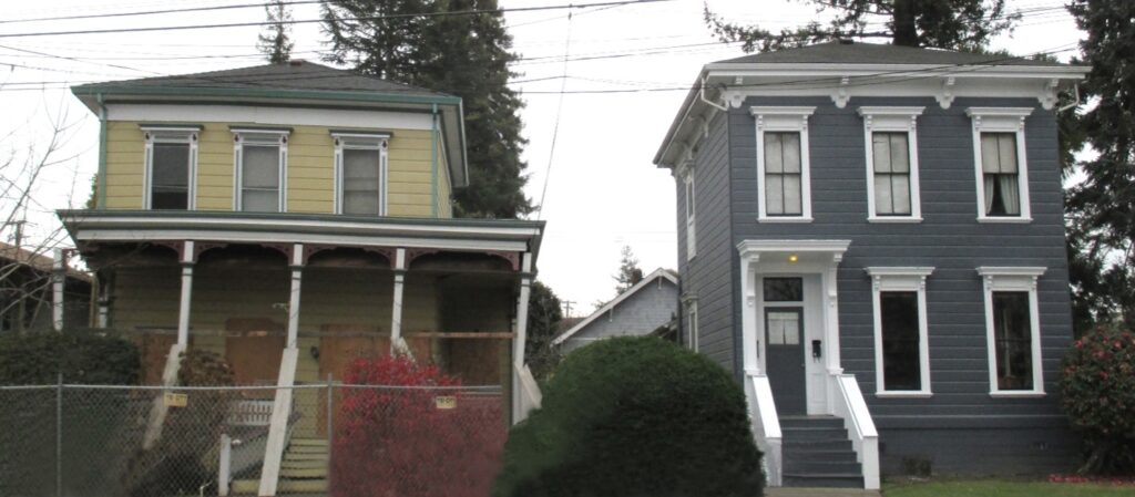 Two homes after the magnitude-6.0 earthquake in Napa, Calif., in 2014. The one that is not retrofitted was too structurally damaged to be immediately habitable (left) while the retrofitted home next door was structurally sound (right). Credit: California Earthquake Authority