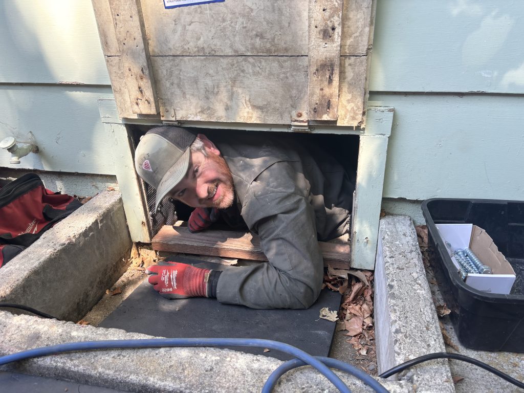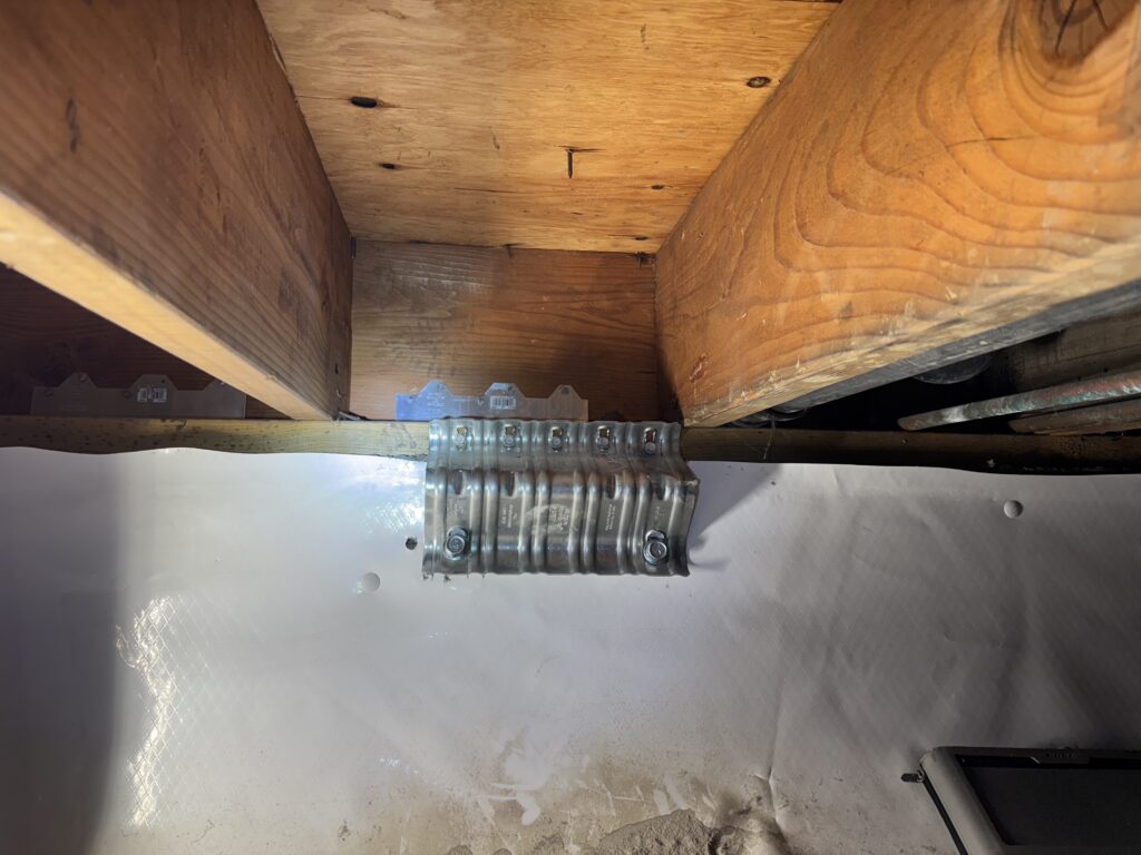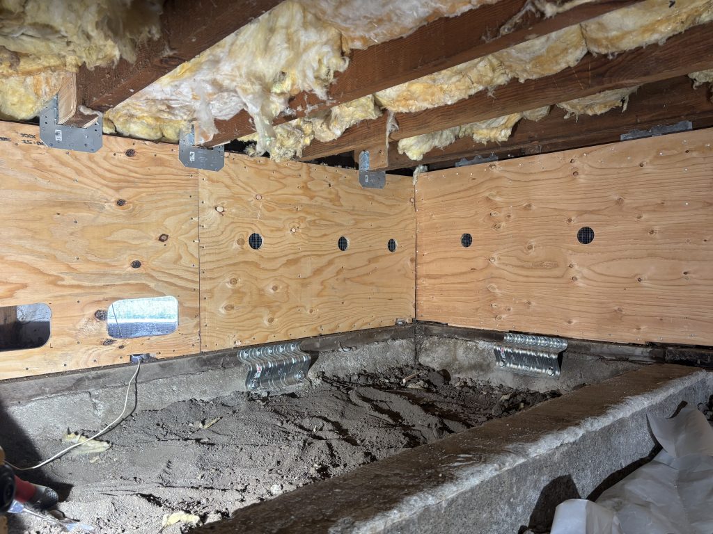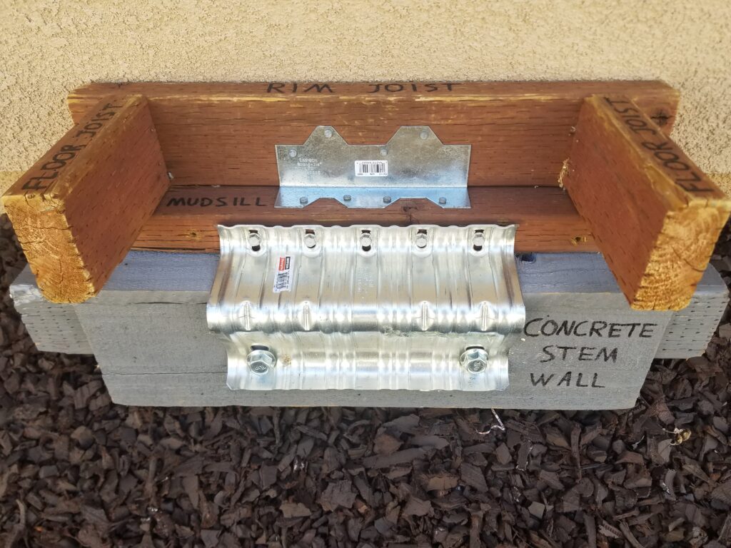 Strengthening hardware for ‘bolt only’ installations: anchor plate to secure mudsill to foundation, and angle bracket to secure rim joist (floor) to mudsill