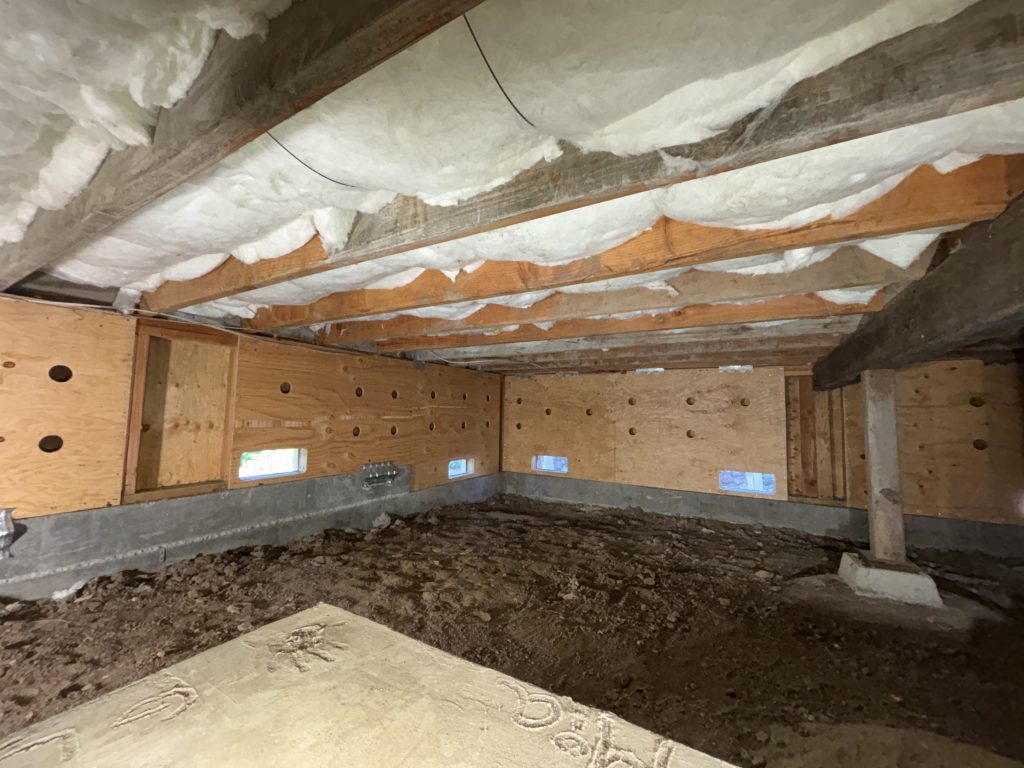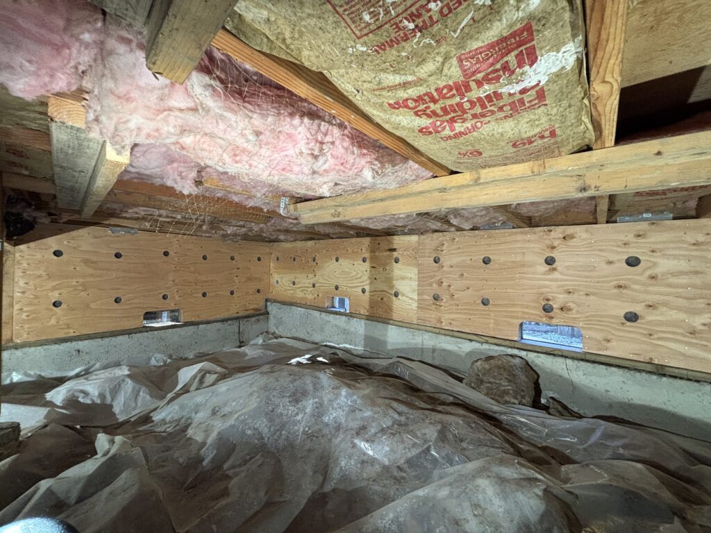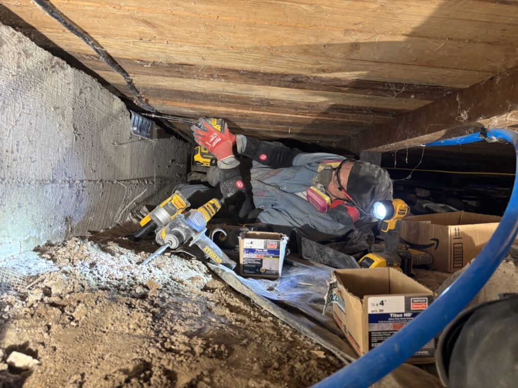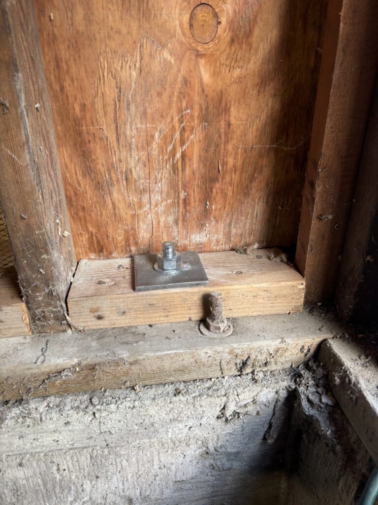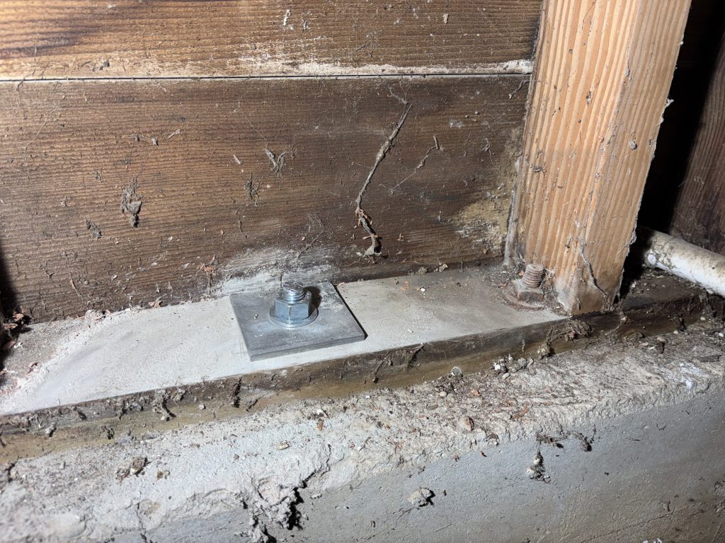 Old anchors: 1/2 inch, not centered, small washer. New anchor: 5/8 inch, centered, 3X3 bearing plate, 5″ plus deep into foundation
